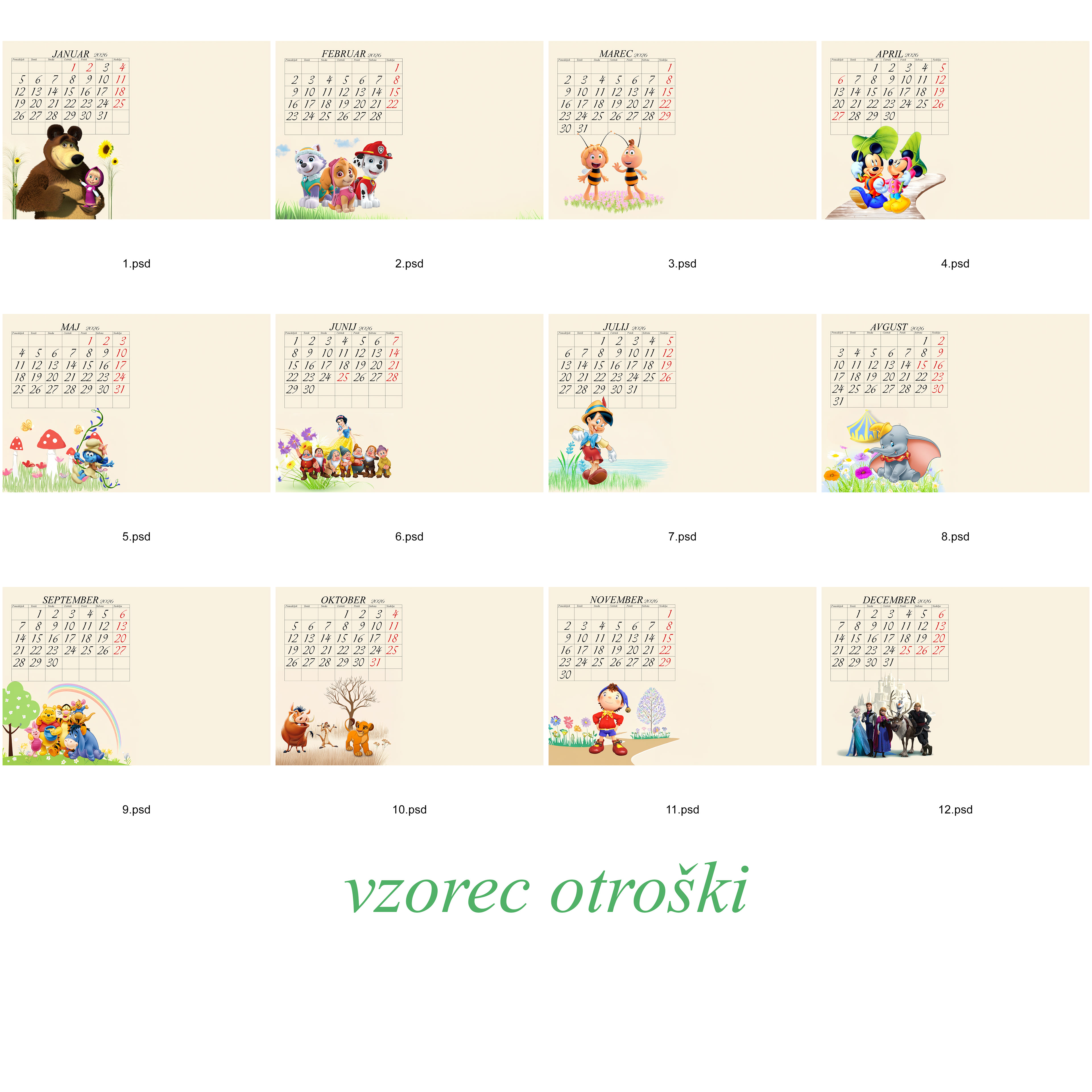 Iz vaših posnetkov vam izdelamo 12 listni foto koledar v velikosti 20x30cm in 30x45cm. Na eni strani je lahko ena ali več fotografij. Po želji vam lahko dodamo tudi tekst. Otroški koledar je možen samo v velikosti 20x30cm.